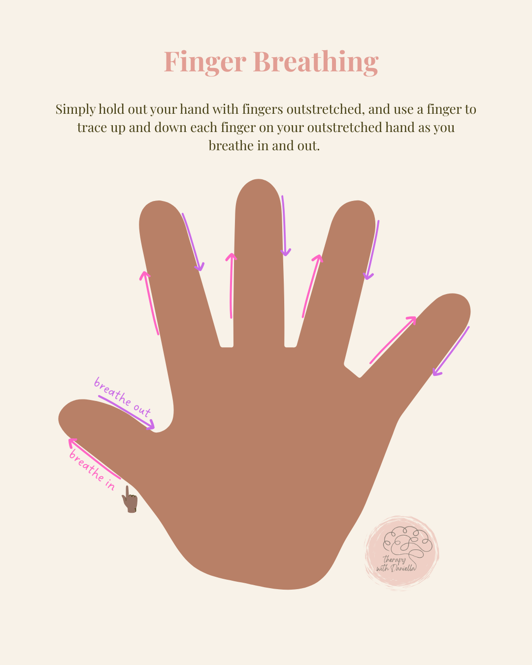 I know we are breathing all day long as humans but when we get anxious our breathing changes and we take short, shallow breaths and even hold our breaths giving us that sensation of a tight chest. Steady, even breaths allow us to effectively regulate and slow down our breathing and tap into our parasympathetic nervous system. My go-to as a therapist is the finger (also called hand tracing) breathing technique because it’s simple, easy (for both adults and children), and is usually easily accessible as you use your fingers to guide your breathing.